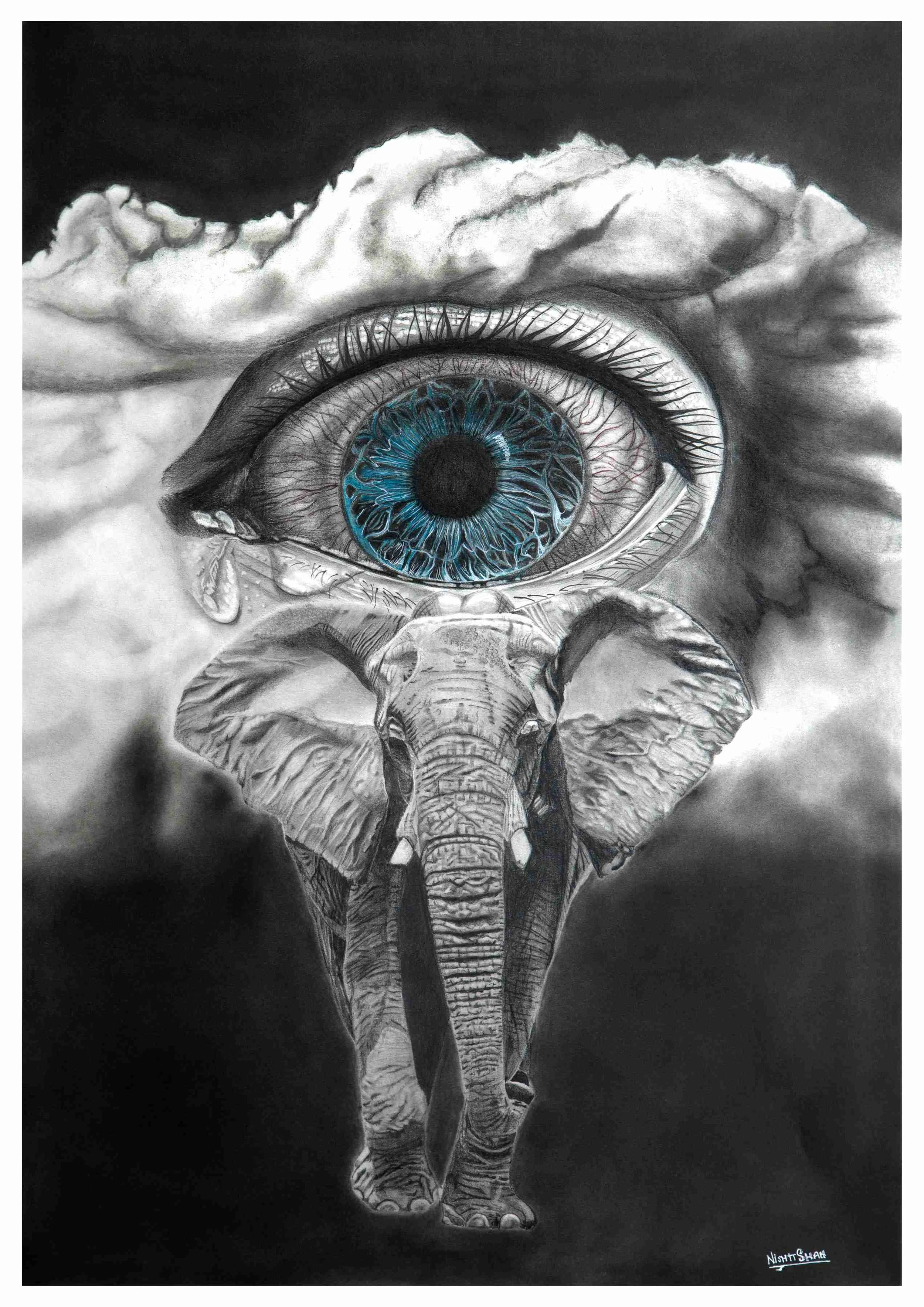 Nish drew this for his love of elephants, to show these beautiful animals are in danger. The Blue eye signifies the feng shui symbol (Evil Eye) meaning good luck and protection.