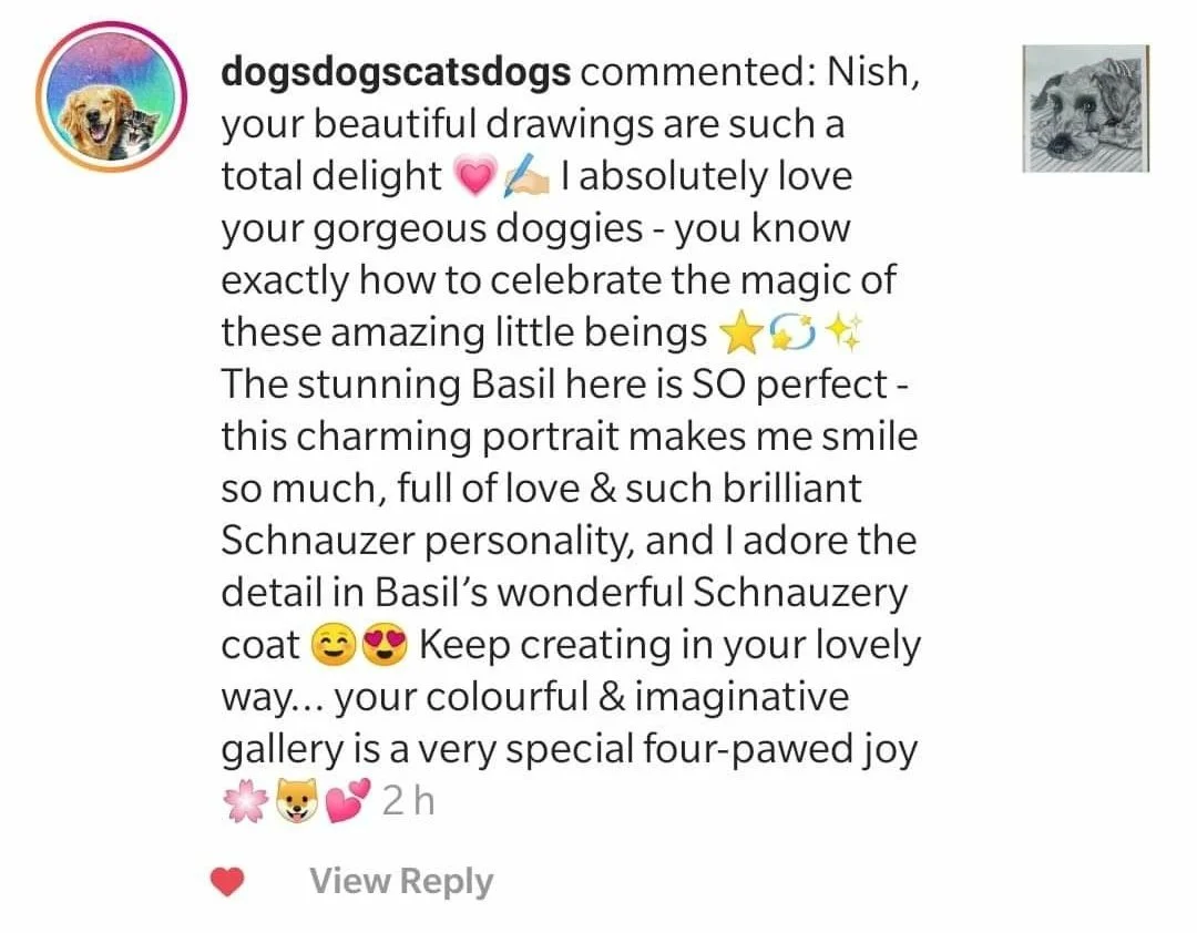 Nish, your beautiful drawings are such a total delight. I absolutely love your gorgeous doggies, you know exactly how to cey the magic of these amazing little beings. The stunning Basil here is SO perfect - this charming portrait makes me smile so much, full of love and such brilliant Schnauzer personality, and I adore the detail in Basil's wonderful Schnauzery coat. Keep creating in your lovely way... your colourful and imaginative gallery is a very special four-pawed joy.